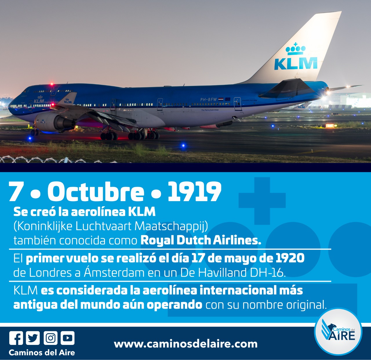 Un día como hoy 7 de Octubre pero de 1919, fue fundada la aerolínea KLM Royal Dutch Airlines, la aerolínea más antigua del mundo. El primer vuelo de KLM se realizó el 17 de...