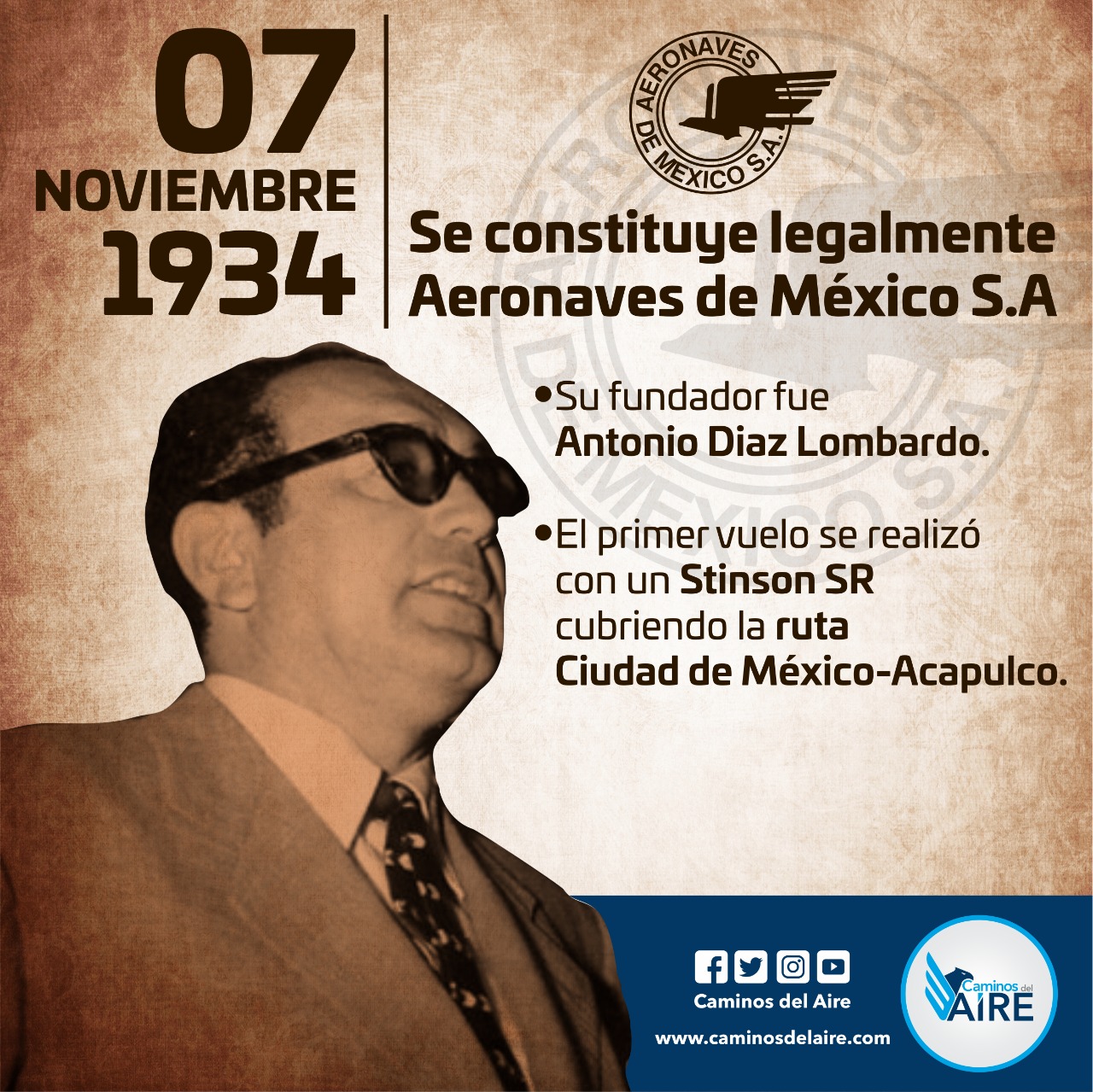 Antonio Díaz Lombardo, fue el creador de lo que hoy es AeroMéxico y cuyo primer vuelo se realizó con un avión Stinson SR, cubriendo la ruta Ciudad de México – Acapulco.