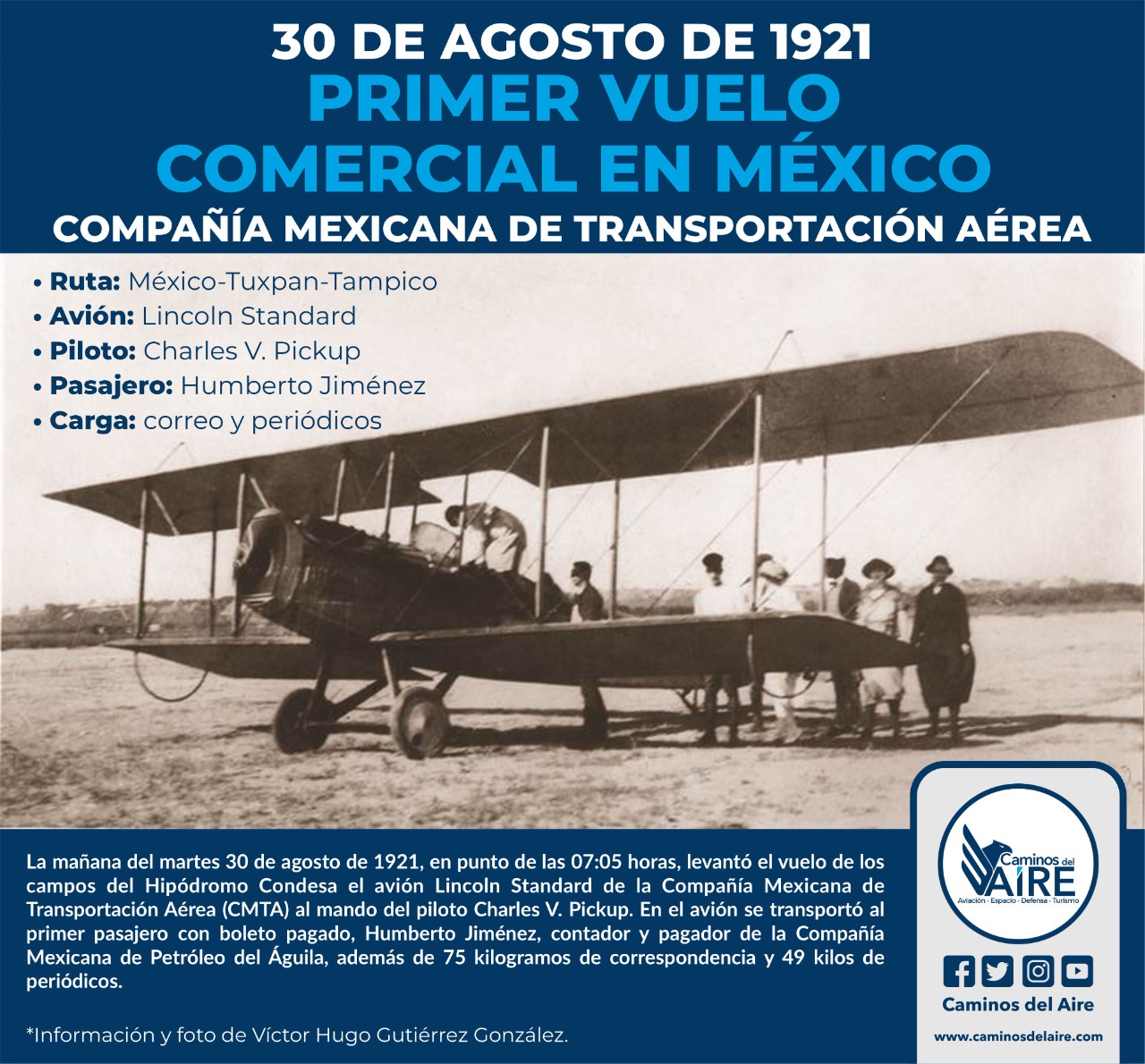 Un día como hoy 30 de Agosto pero de 1921, la Compañía Mexicana de Transportación Aérea (CMTA), realizó el primer vuelo comercial en México. Humberto Jiménez se convirtió en el primer pasajero con boleto...
