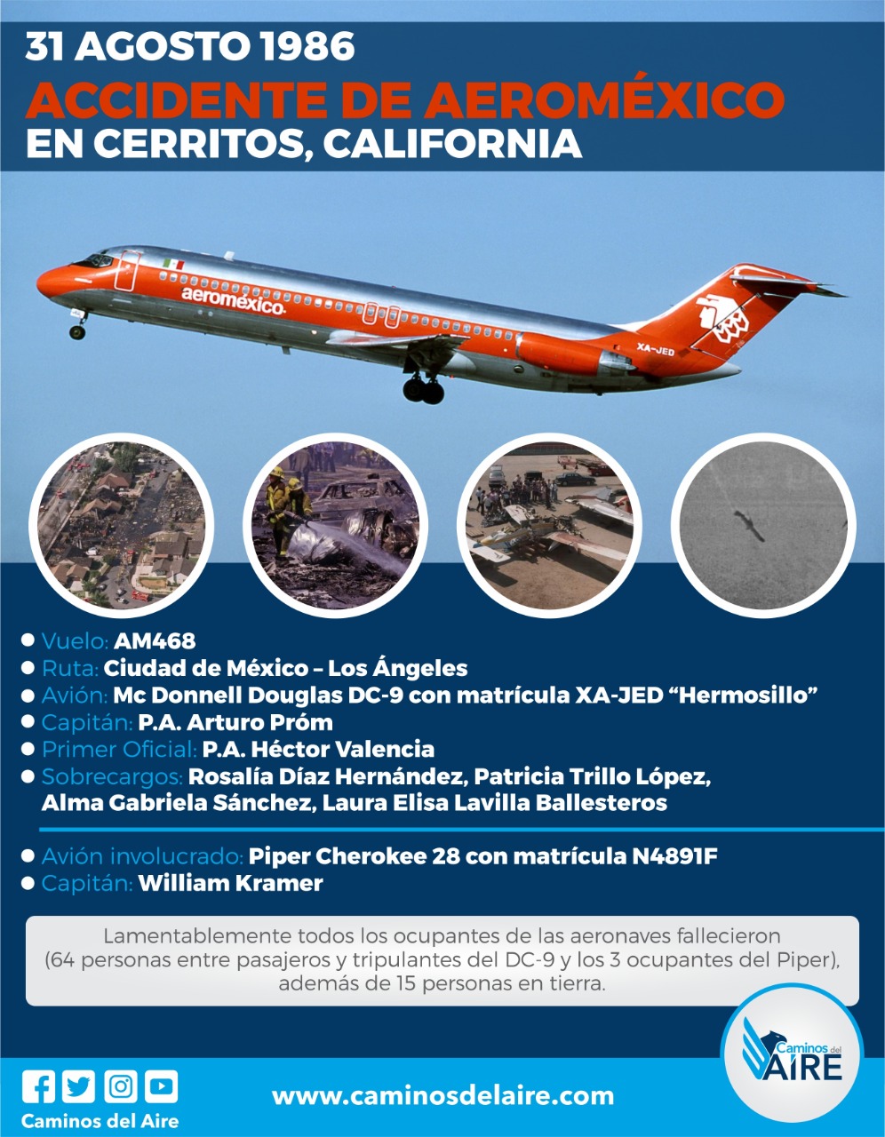 Un día como hoy 31 de agosto pero de 1986, un DC-9 realizaba su aproximación final al Aeropuerto Internacional de los Ángeles, en su trayectoria de descenso, un Piper Cherokee incursionó en su trayectoria....